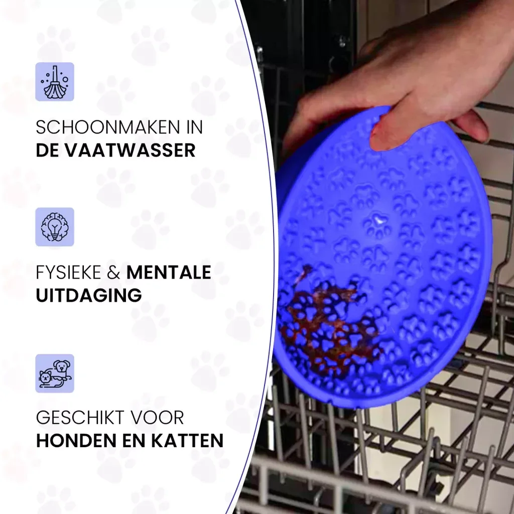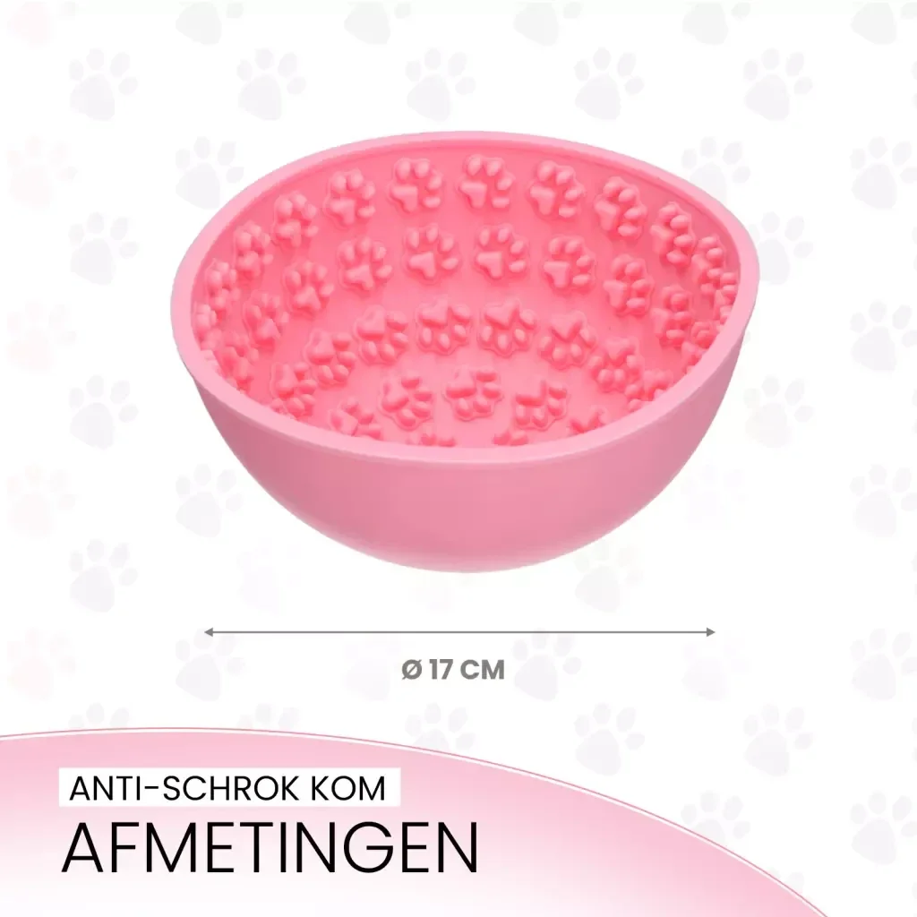Deze anti-schrok kom en likmat in één is perfect voor het afleiden of belonen van je hond of kat! Deze kom heeft noppen in de vorm van pootafdrukken aan de binnenzijde en een ronde onderkant. Je hond of kat zal goed tussen de nopjes moeten likken om al het lekkers uit de kom te krijgen, terwijl de kom heen en weer wiebelt. Dit zorgt voor extra uitdaging en plezier!